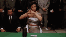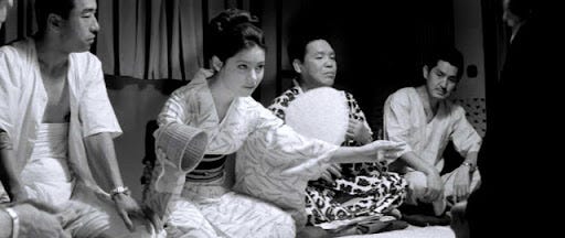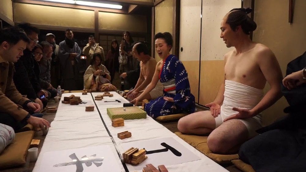 All-male gamblers surrounding a woman running the traditional Japanese dice game “Cho Han.” This scene plays out in many movies and video games (like the Yakuza games and Rise of the Ronin).