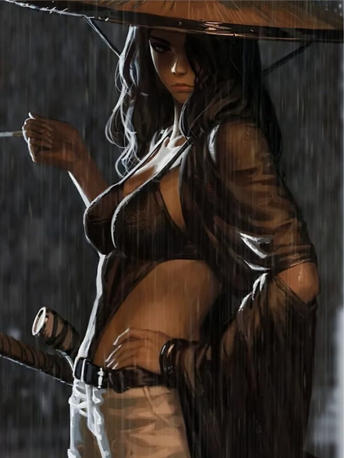As far as her fighting prowess, I had to push it a little further than Meiko’s martial arts (few and far between, often too short, but appreciated for quick deadliness). Takana’s fighting style had to come from a place of high discipline paired with the more-realistic anything-goes fighting one might find outside major cities of the time. Of course, that had to be Beatrix Kiddo—the poster child for brutal, unconventional, dirty fighting with various blades, but heavily-focused on the katana.